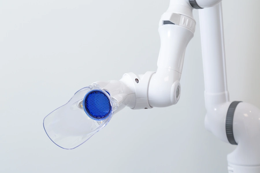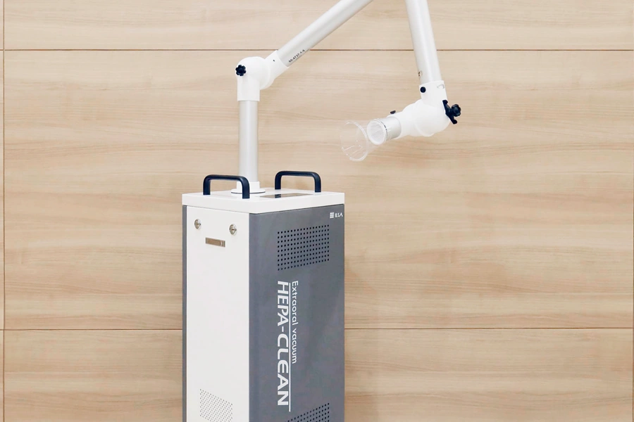 口の中では口腔内バキュームで吸引し飛散を抑えていますが、口腔外バキュームは、治療上お口の外、空気中へ飛散した微粒子を吸引するための機器です。診療スペース全体の衛生環境を保つことも重要な衛生管理の一つです。