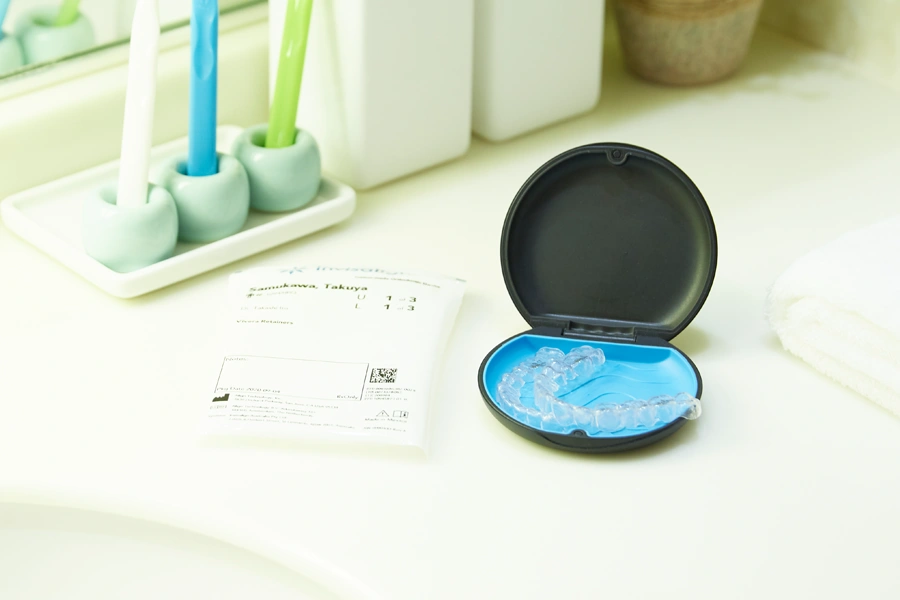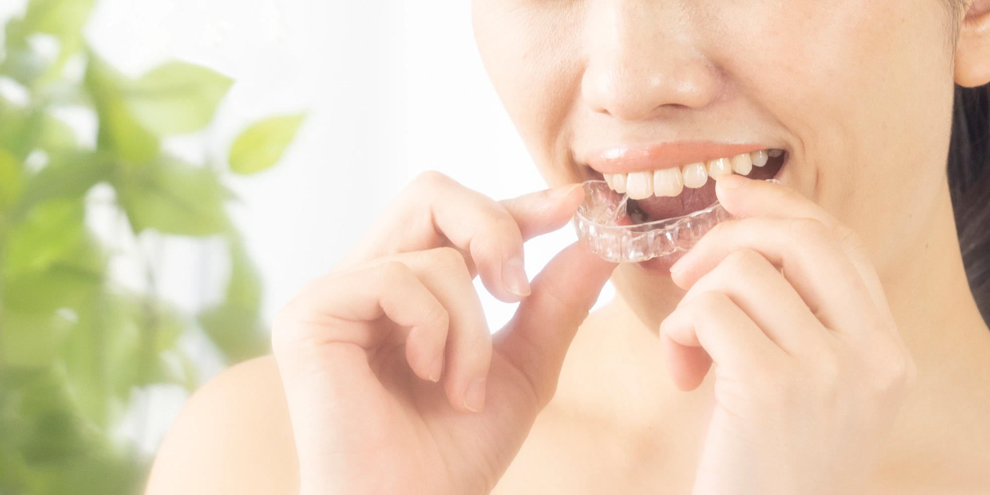 マウスピースはご自身で簡単に着け外しができます。食事の際には取り外せるので、食べ物が装置に詰まる心配がありません。また、歯磨きの際も取り外せるので、口腔内を清潔に保つことができ、歯周病のリスクを軽減できます。